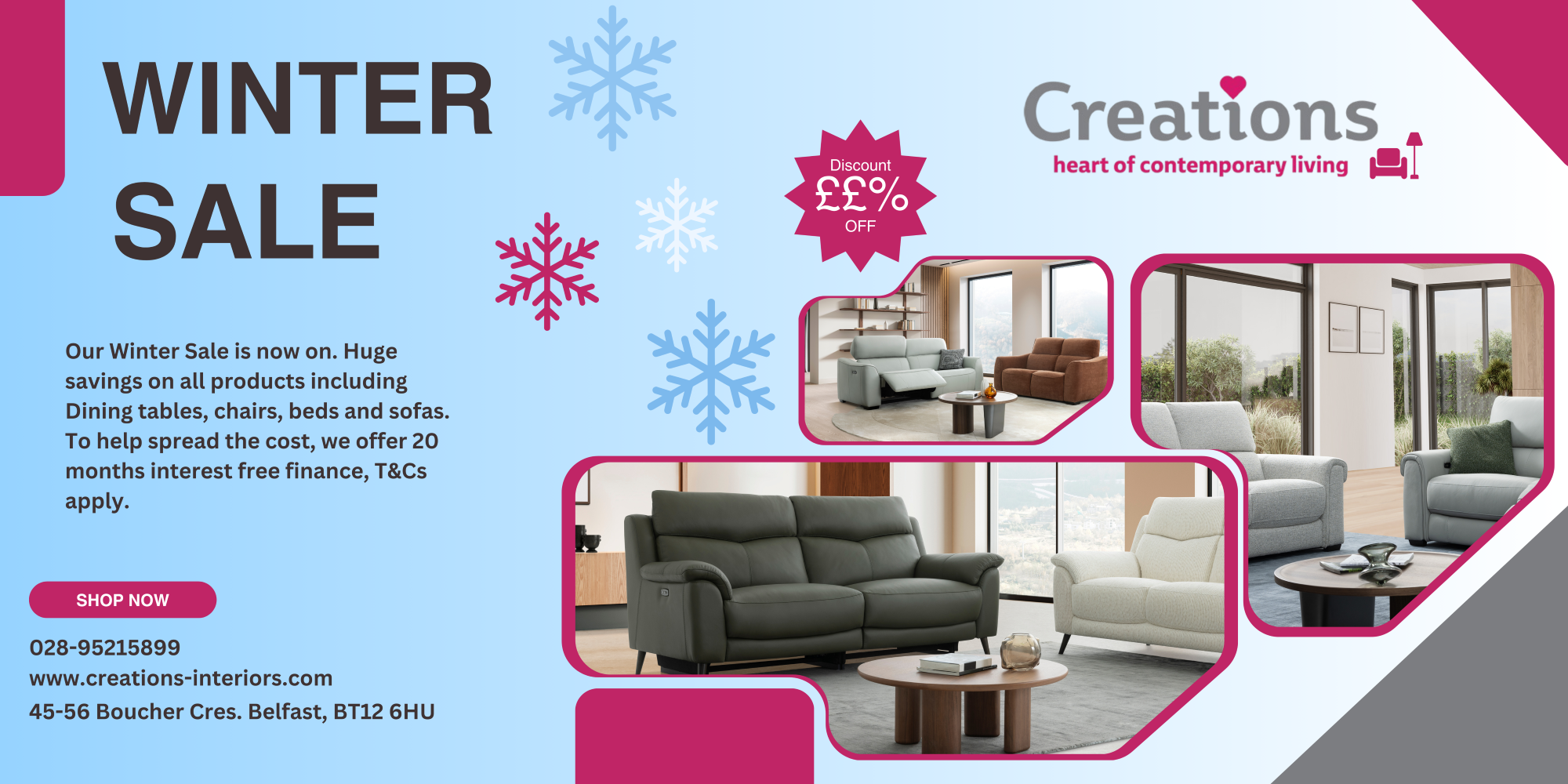 Our Winter Sale is now on. Huge savings on all products including Dining tables, chairs, beds and sofas. To help spread the cost, we offer 20 months interest free finance, T&Cs apply