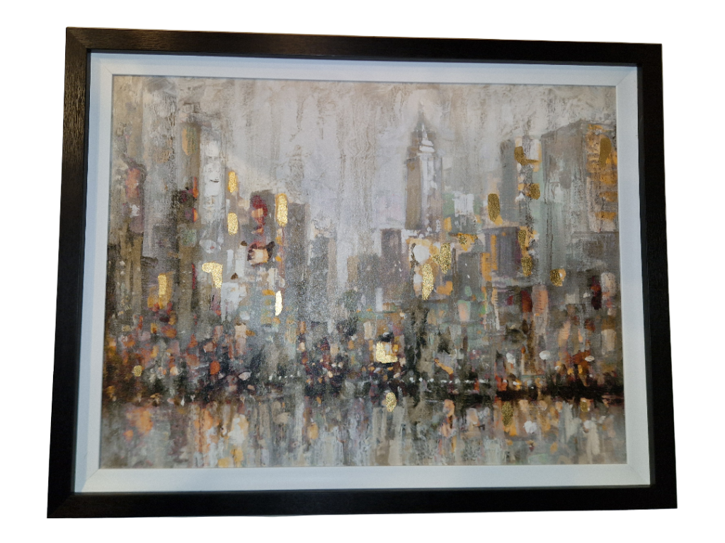 Framed, and ready to hang. This frame contains an abstract painting of a cityscape.