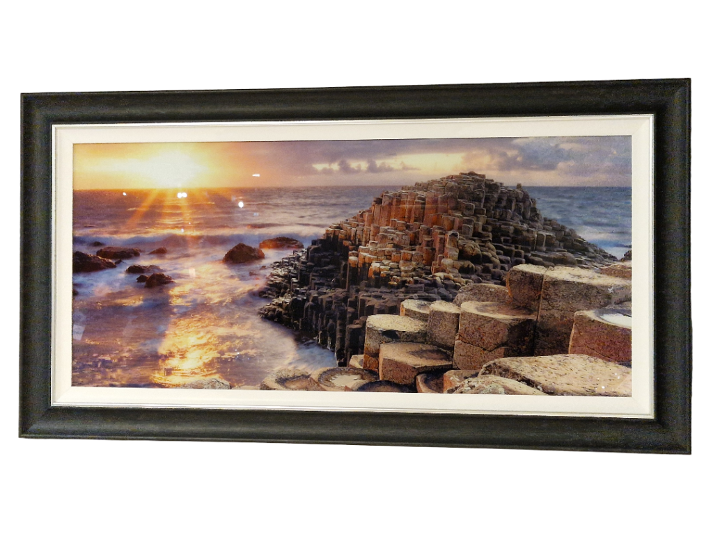 This beautiful frame contains a magnificent picture of the mythical Giants Causeway, considered one of the many wonders of Earth. Framed, and ready to hang.